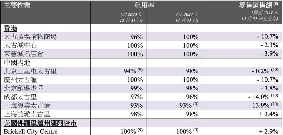 而广州太古汇、上海兴业太古汇及上海前滩太古里的出租率维持不变,分别为100%、93%及98%。至于销售额方面,这三个项目的销售额变动为减少10.7%、下降13.9%、增长3.4%。